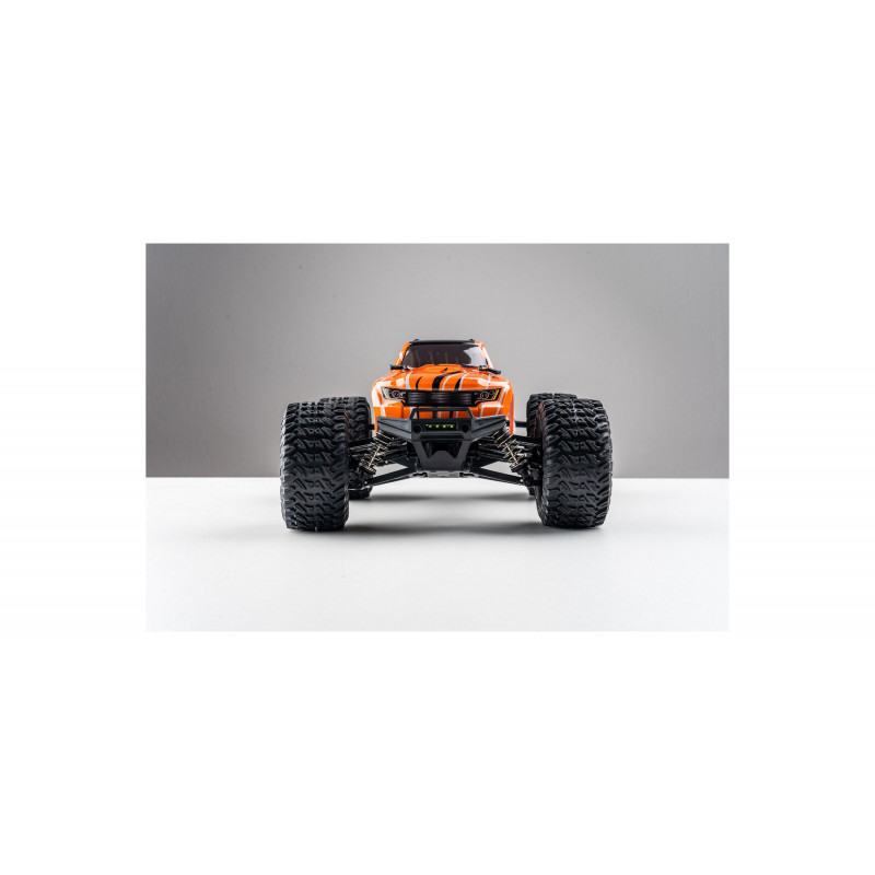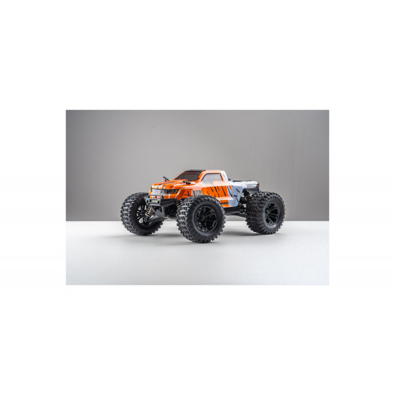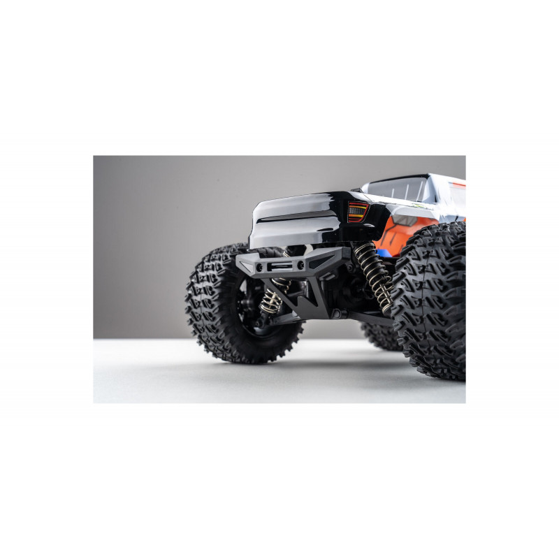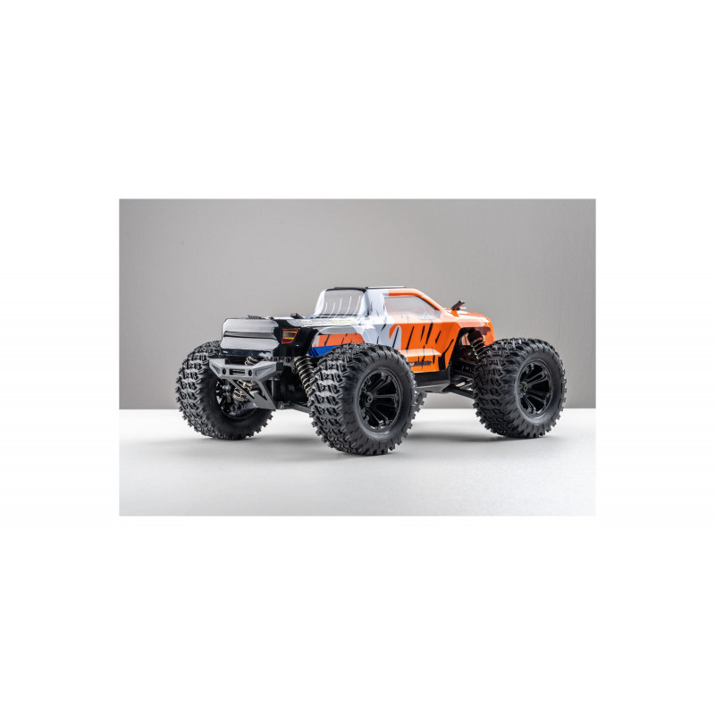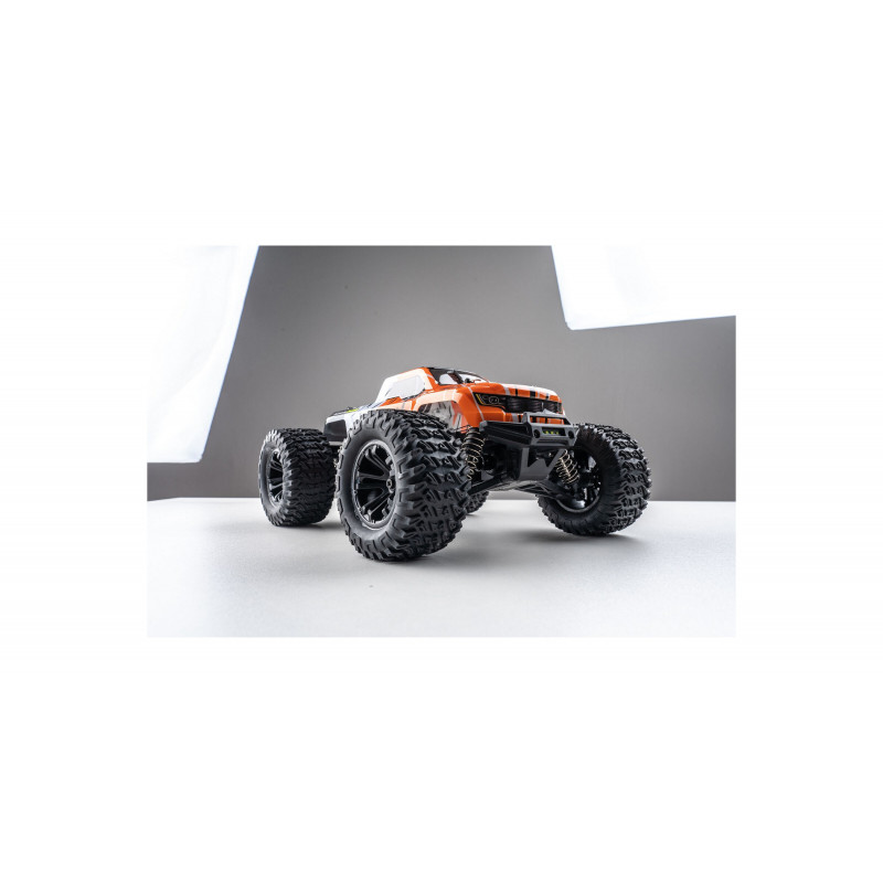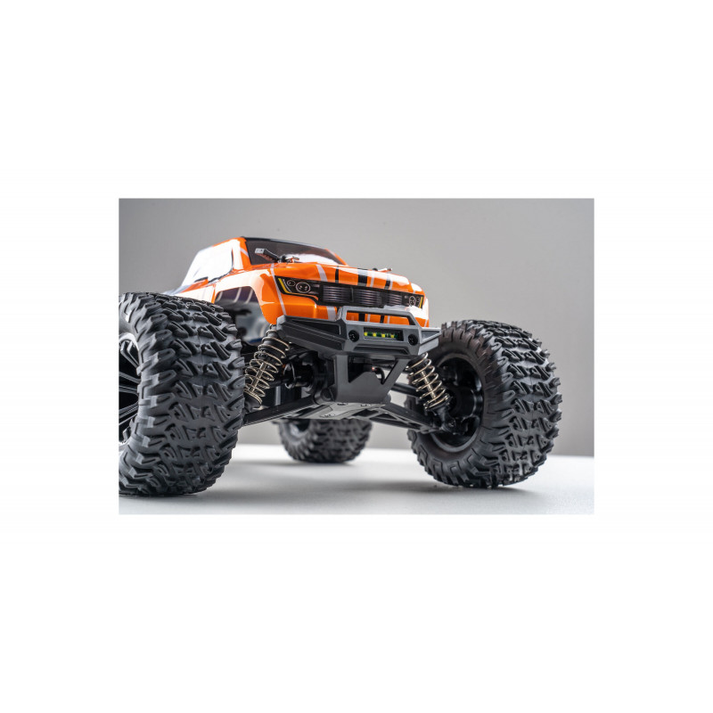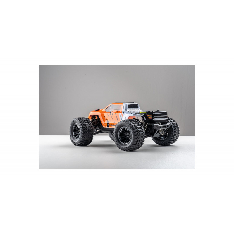 Электроника этого монстра обеспечивает отличную стабильность: радиопередатчик с частотой 2,4 ГГц, комбинация регулятора скорости и приёмника, а также пропорциональный сервопривод для комфортного управления. В этой модели установлен мощный щеточный мотор 370 класса с алюминиевым радиатором охлаждения. Машина готова к эксплуатации сразу — в комплекте идет аккумулятор LiPo 7.4 В 1500 мАч и USB-зарядное устройство, обеспечивающие около 15 минут работы с одного заряда. Также в комплекте есть передние светодиодные фары для езды в темноте.