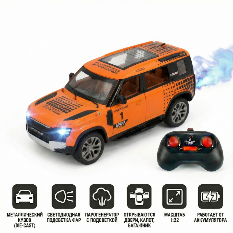 Радиоуправляемая металлическая машина Land Rover Defender 1:22 - HCL-3810-ORANGE - это стильная и детализированная модель с кузовом DIE-CAST, светодиодной подсветкой фар и эффектным парогенератором с подсветкой. Открывающиеся двери, капот и багажник делают модель максимально реалистичной. Отличный вариант для игры и подарка.