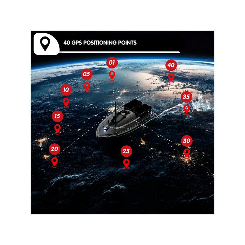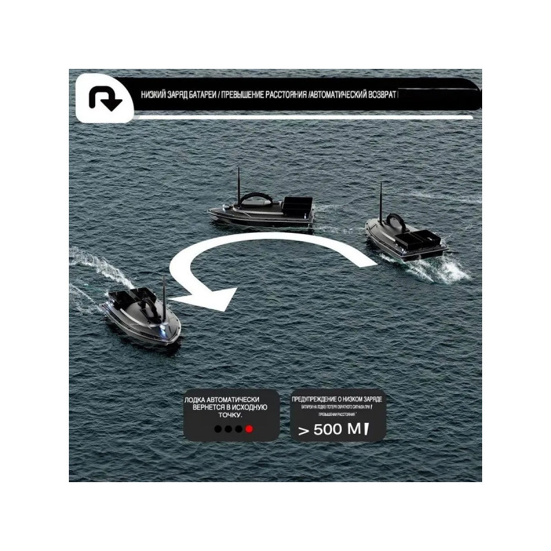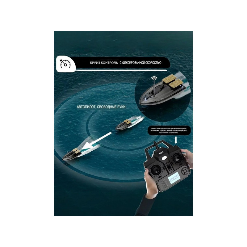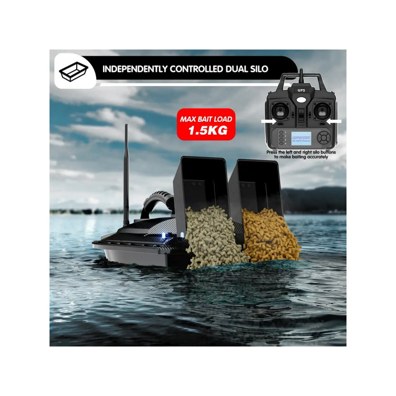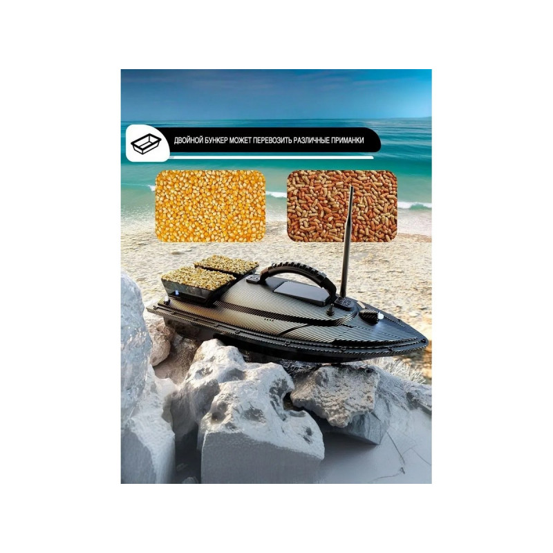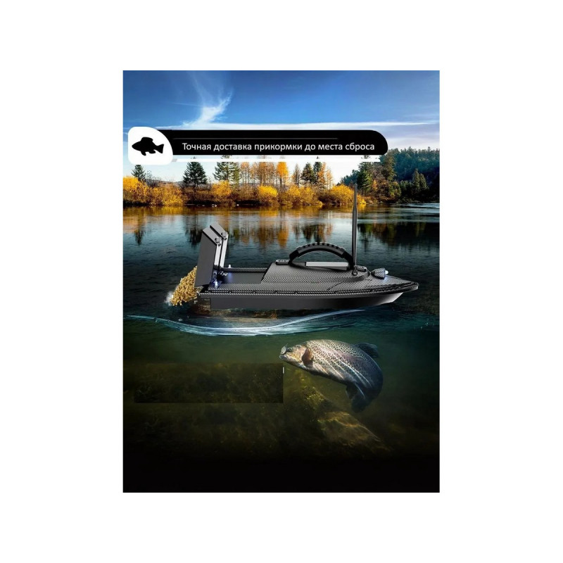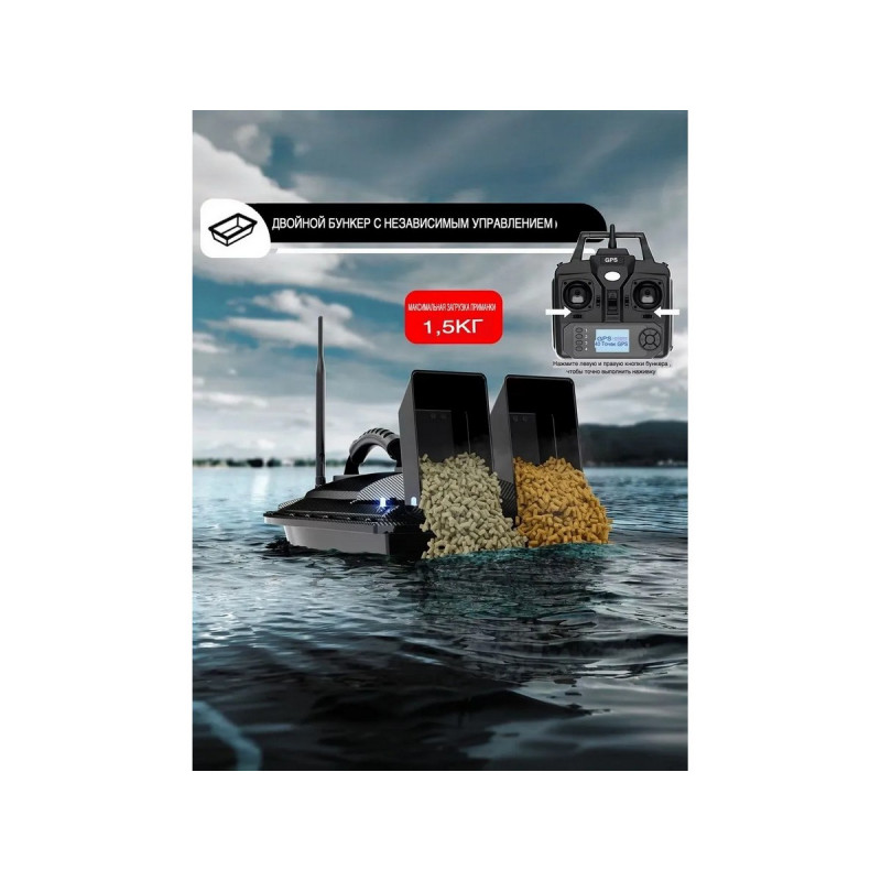 Система GPS и автопилот: Позволяет сохранять до 40 точек позиционирования. Кораблик может автоматически возвращаться в исходную точку при потере сигнала, низком заряде батареи или по команде пользователя.Грузоподъемность: Оснащен двумя независимыми бункерами общей емкостью до 1,5 кг. Бункеры можно открывать по отдельности или одновременно.