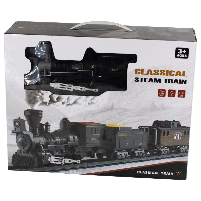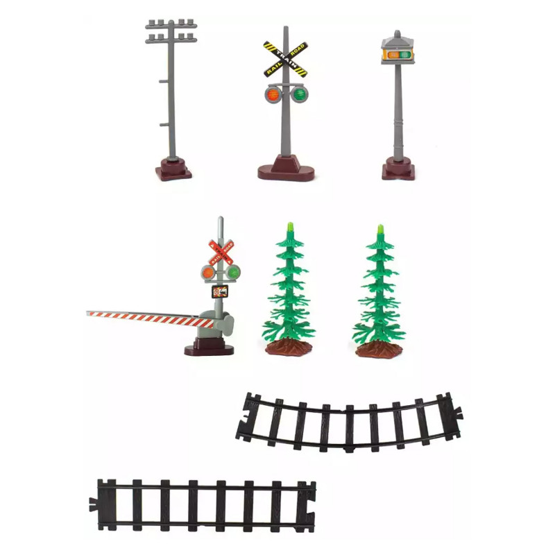 Комплект поставки: локомотив, вагонетка с углем, вагон-рефрижератор, вагон-хоппер, железнодорожное полотно (18 сегментов), железнодорожные знаки, деревья, емкость для воды